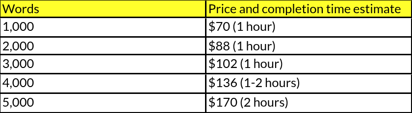 For undergraduate students or any work that is less than 5,000 words, we charge $0.05 per word. For an idea of pricing and time, you can see the figure below.