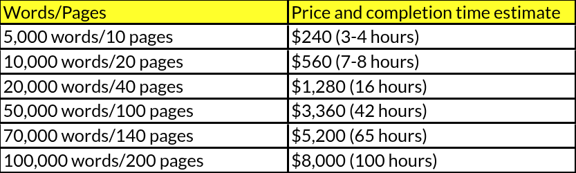 For postgraduate students, working professionals in the academic field such as professors, scientists, or researchers, or for any work that is more than 5,000 words, we charge $80 per hour. The reason for this change in pricing model is that for longer bodies of work and for those that are niche and specified areas of study, which themselves are most often quite long in length, it is harder to gauge an exact time that is needed, as our editors need to familiarize themselves with the subject matter so that they can better edit and advise within the specific context, fact check, more effectively enhance and crystallize ideas and talking points, and assist in strengthening points. For a better idea of estimated cost and time based on your word and/or page length, you can refer to the below figure.